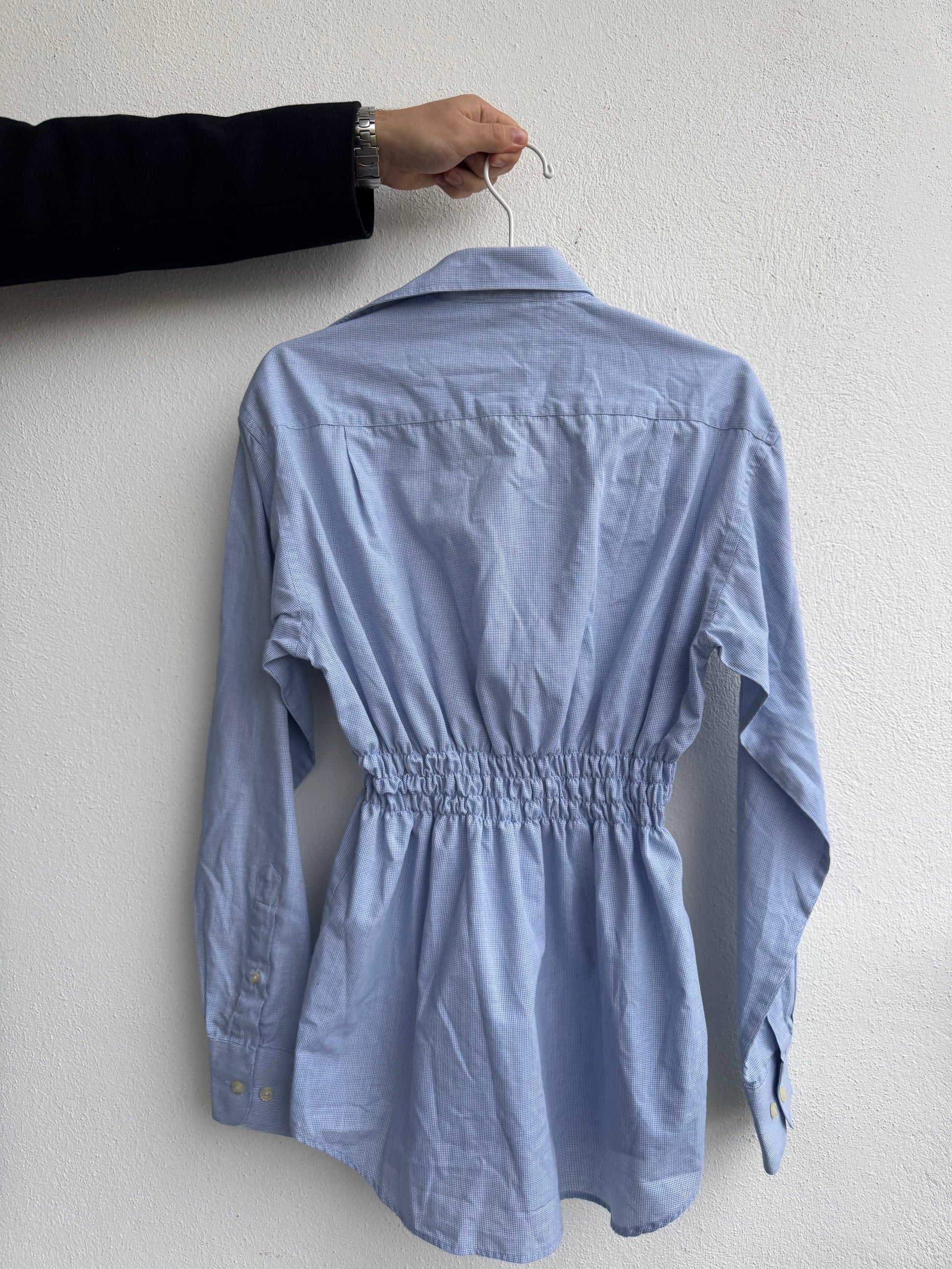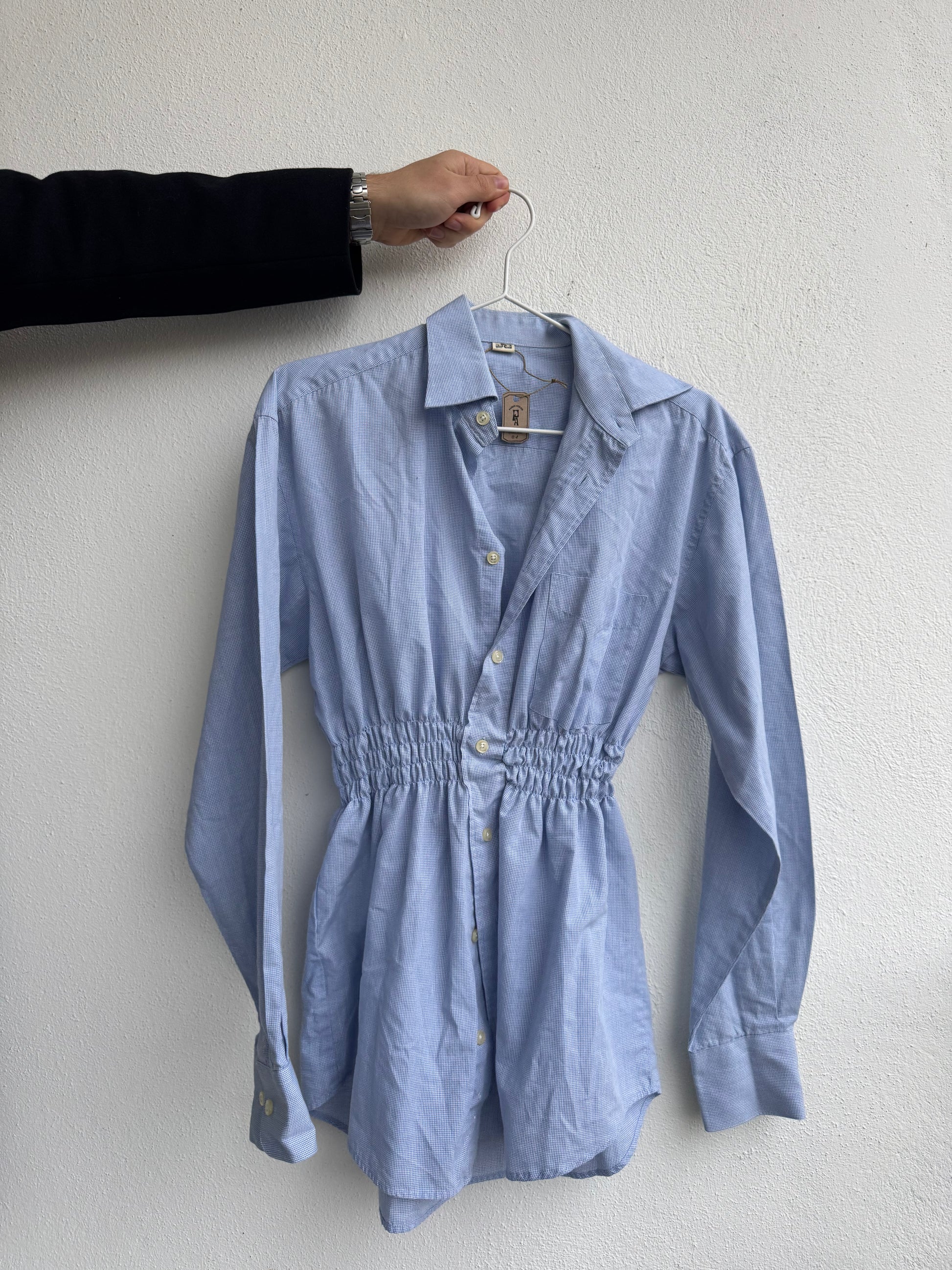 Observera: Skjortan är ihopsydd mellan två knappar och träs på över huvudet.