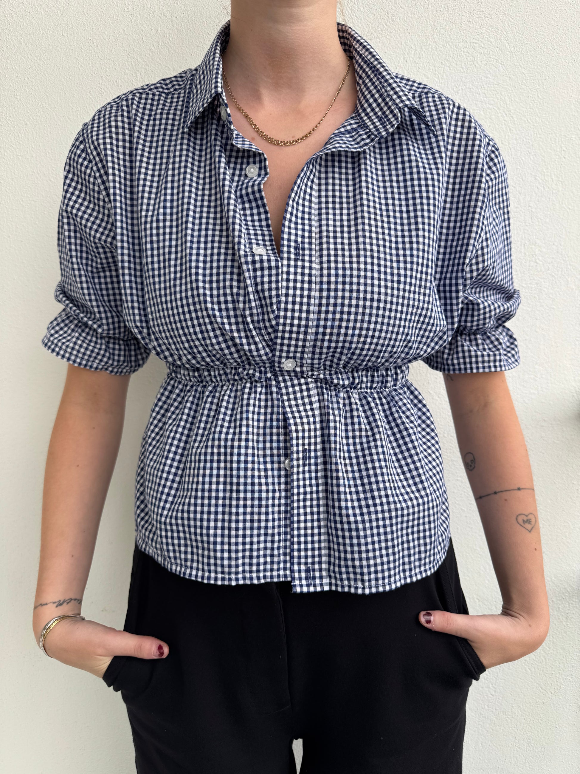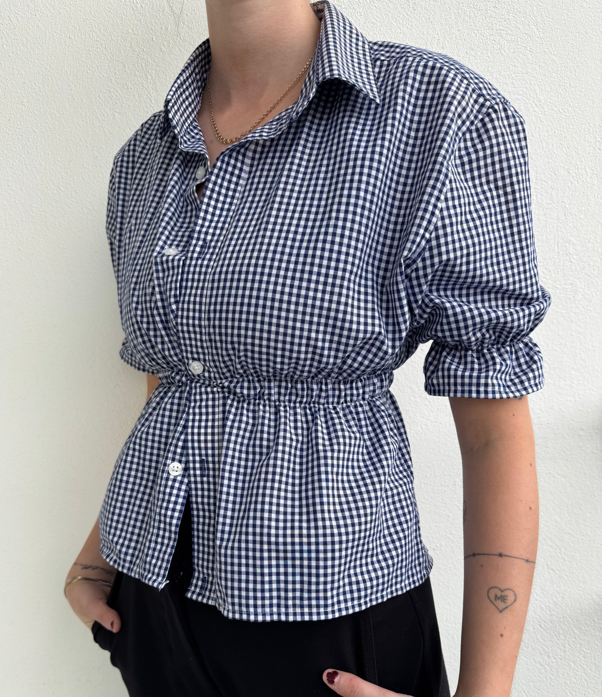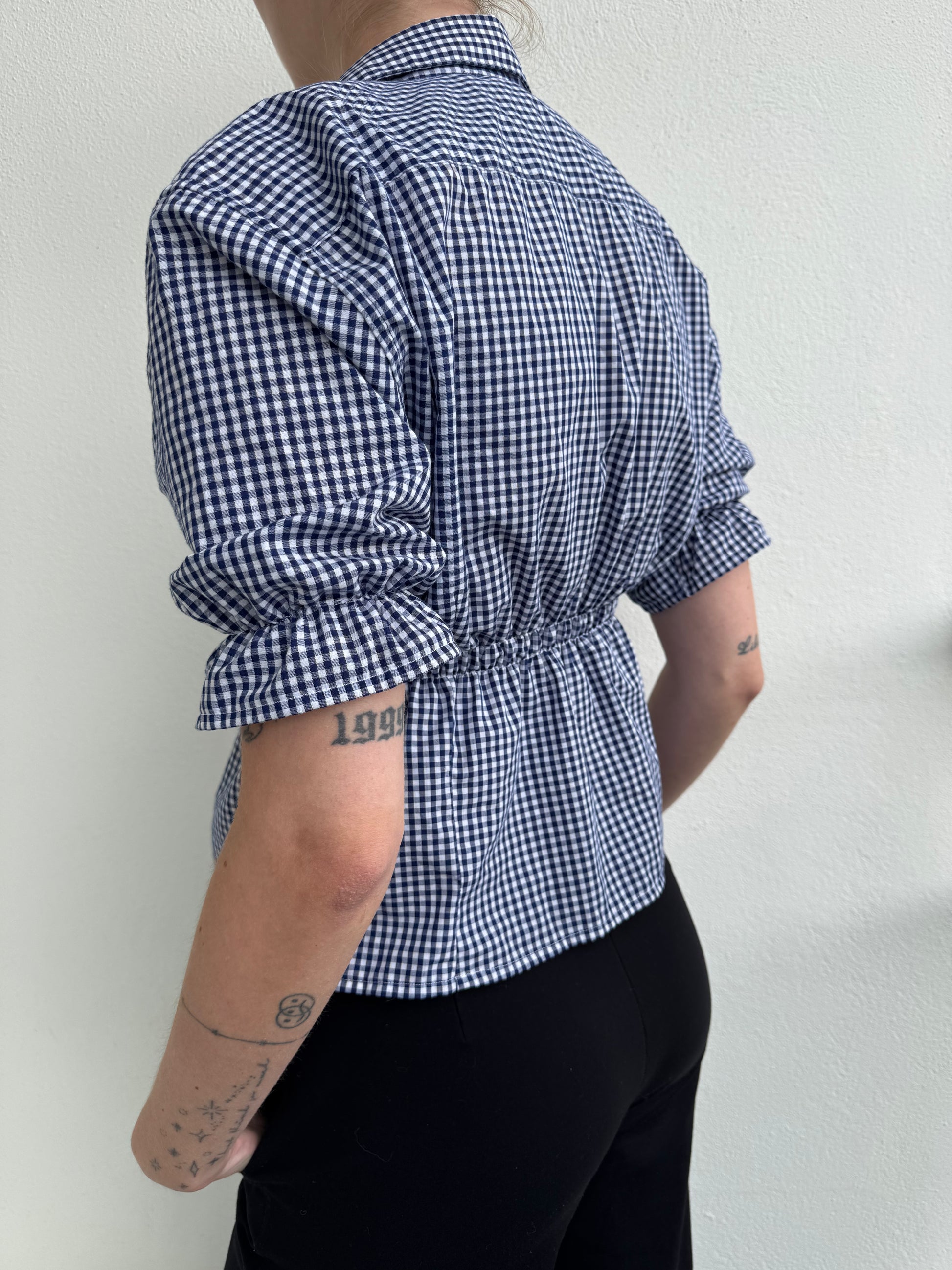 Observera: Toppen är ihopsydd mellan två knappar och tas på över huvudet.